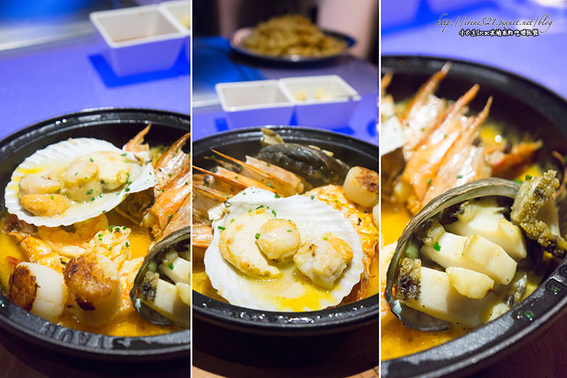一打開塔吉鍋上蓋,澳洲野生明蝦、冰鮮大鮑魚、北海道干貝、扇貝等等,
