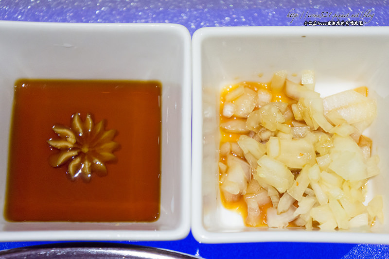 桌面上的「芥末醬油」&「洋蔥」可搭配餐點使用。