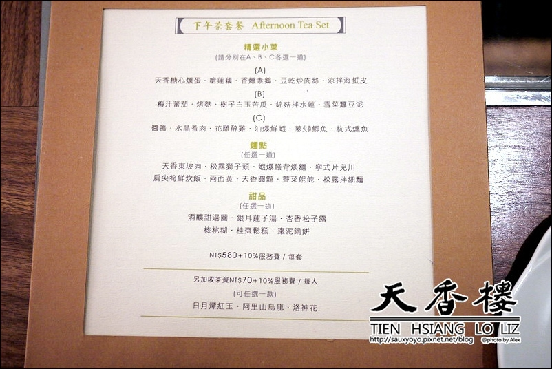 一為580元下午茶套餐,可以選擇三道經典小菜、一道主食麵點、甜品,茶品另外加收70元。