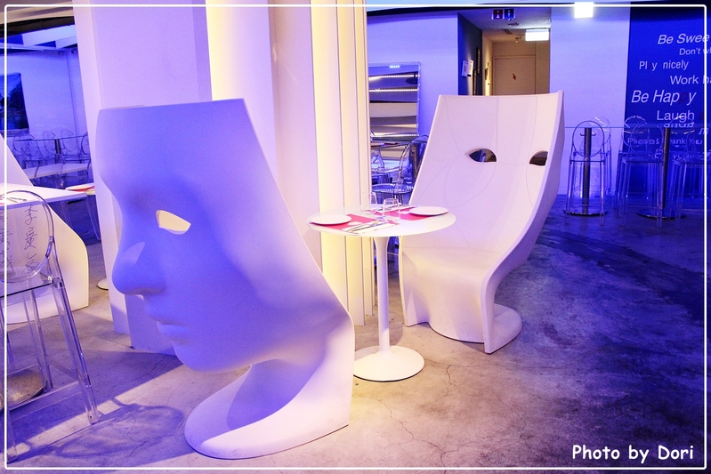 面具椅算是店家的特有的設計之一,來自義大利Driade的人氣商品,在投射燈的照耀之下,似乎也變成了一件藝術品,而且沒想到當天就要坐在這張椅子上用餐。