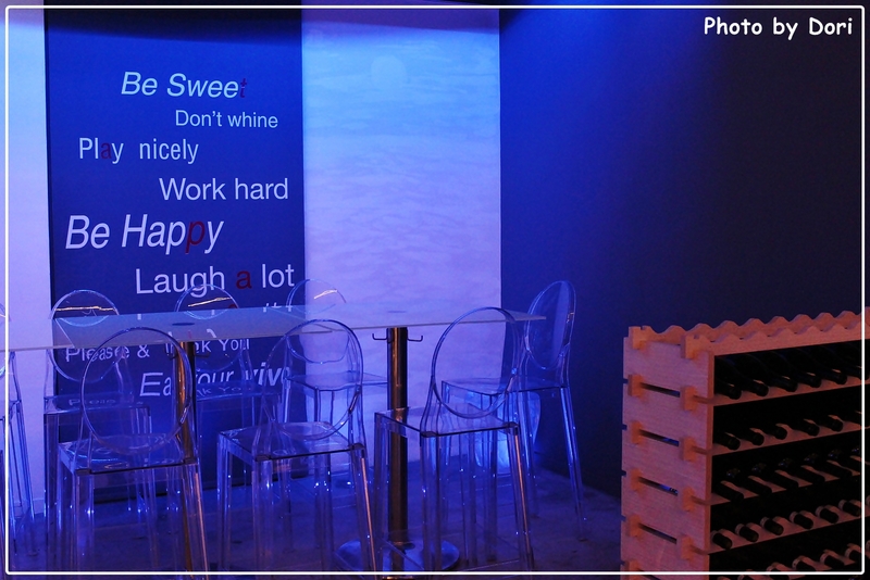服務人員親切帶位至地下二樓,視覺上會發現為較湛藍的冷色調,以白色調性互相搭配。其中也看到不少支紅酒或白酒倒放置在木櫃當中,這次的試菜聽說也能品嚐,應該是可以期待一下。