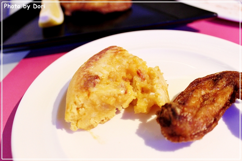 開胃菜可以選擇二道,首先端上的是雪莉酒醋雞翅,三角盤的擺設放置了四隻雞翅做堆疊,酒醋醃製後的烘烤方式有種酸甜味,達到非常讓人吮指回味的效果。