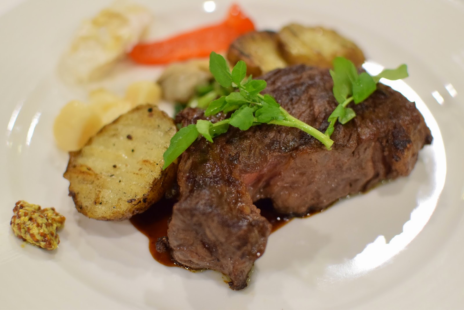 頂級老饕肋眼牛排外表煎得焦香,裡頭也是粉紅軟嫩,但又多了飽含油脂的美味,我選擇搭配芥末子醬,更添風味!