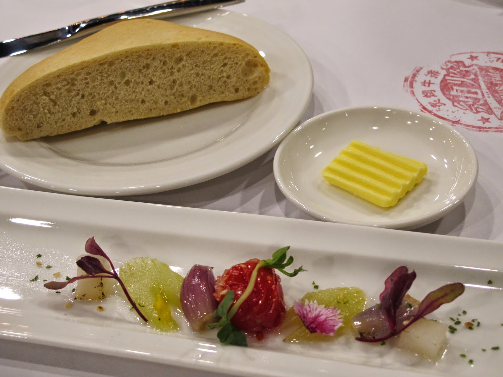 首先,點完菜後會先上開胃小點與烘烤得熱呼呼的麵包,烤過的各式蔬菜、蕃茄、紅蔥頭吃起來甜甜的,應該是用糖漬過的,配上口感紮實的麵包與常溫奶油,清爽可口。