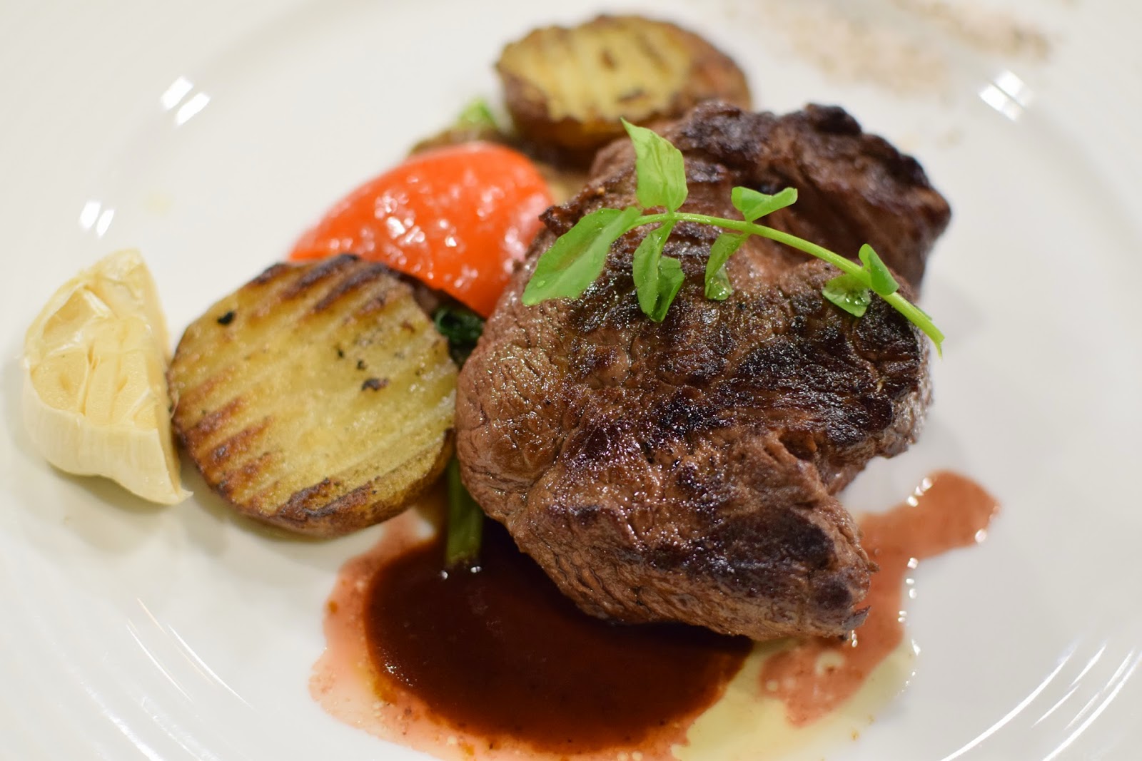 頂級菲力牛排以五分熟的火候呈現,外皮烤得酥微香,內層軟嫩多汁,這是我最喜歡的牛排部位,全瘦肉的口感不油膩,也是最柔軟好吃的牛排部位,輕易的就能用刀劃開肉、粉紅色的肉汁順著刀鋒湧出,顯示高溫炙烤讓肉汁鎖在裡面,因此如此好吃,再搭配著一旁的烤馬鈴薯、烤紅椒、炒波菜,真的是很豐盛完整的組合。