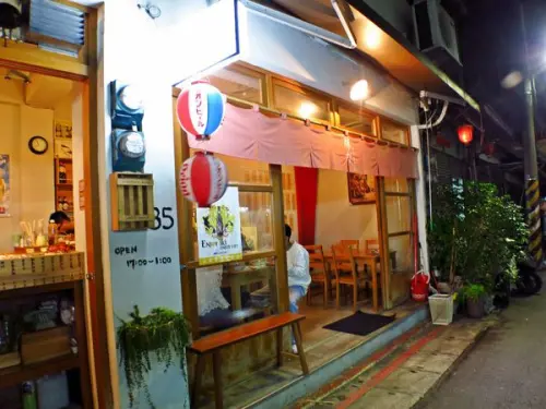 這間店的門口以木頭與磚牆作為主題, 與一般店面不同的是, 沒有大片的玻璃窗