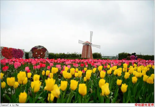 浪漫的鬱金香加上身後的風車景象,讓人置身於國外的錯覺