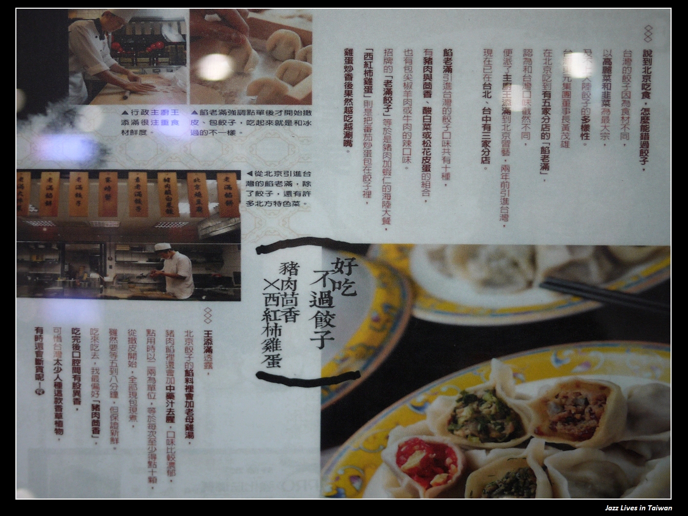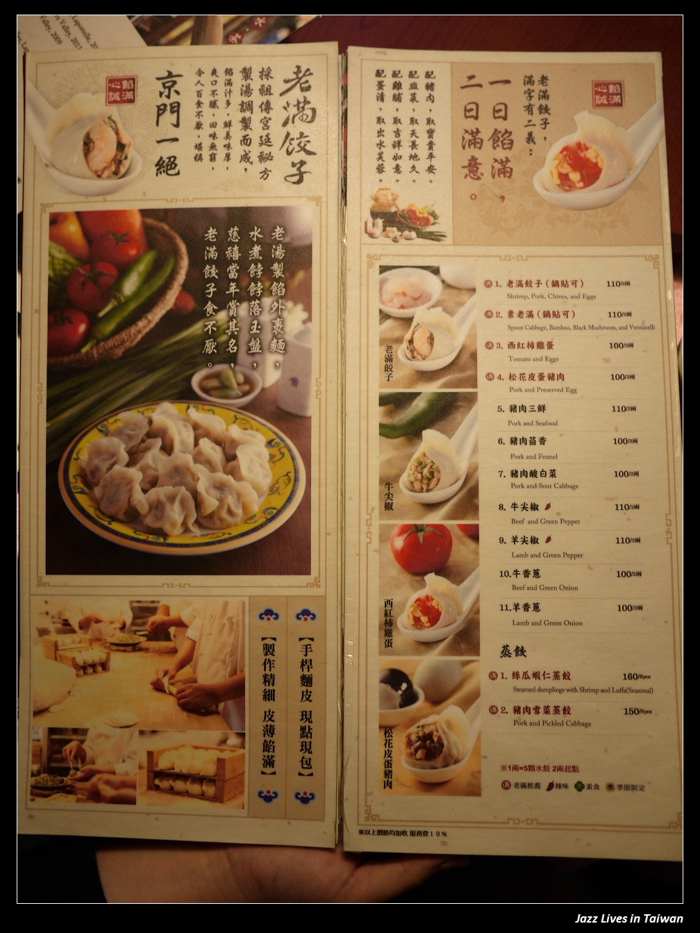 老滿餃子(110/2兩), 約10顆, 算起來一顆約11元, 價錢略高, 不過若真如店家所說, 現點現桿餡包, 則還OK,