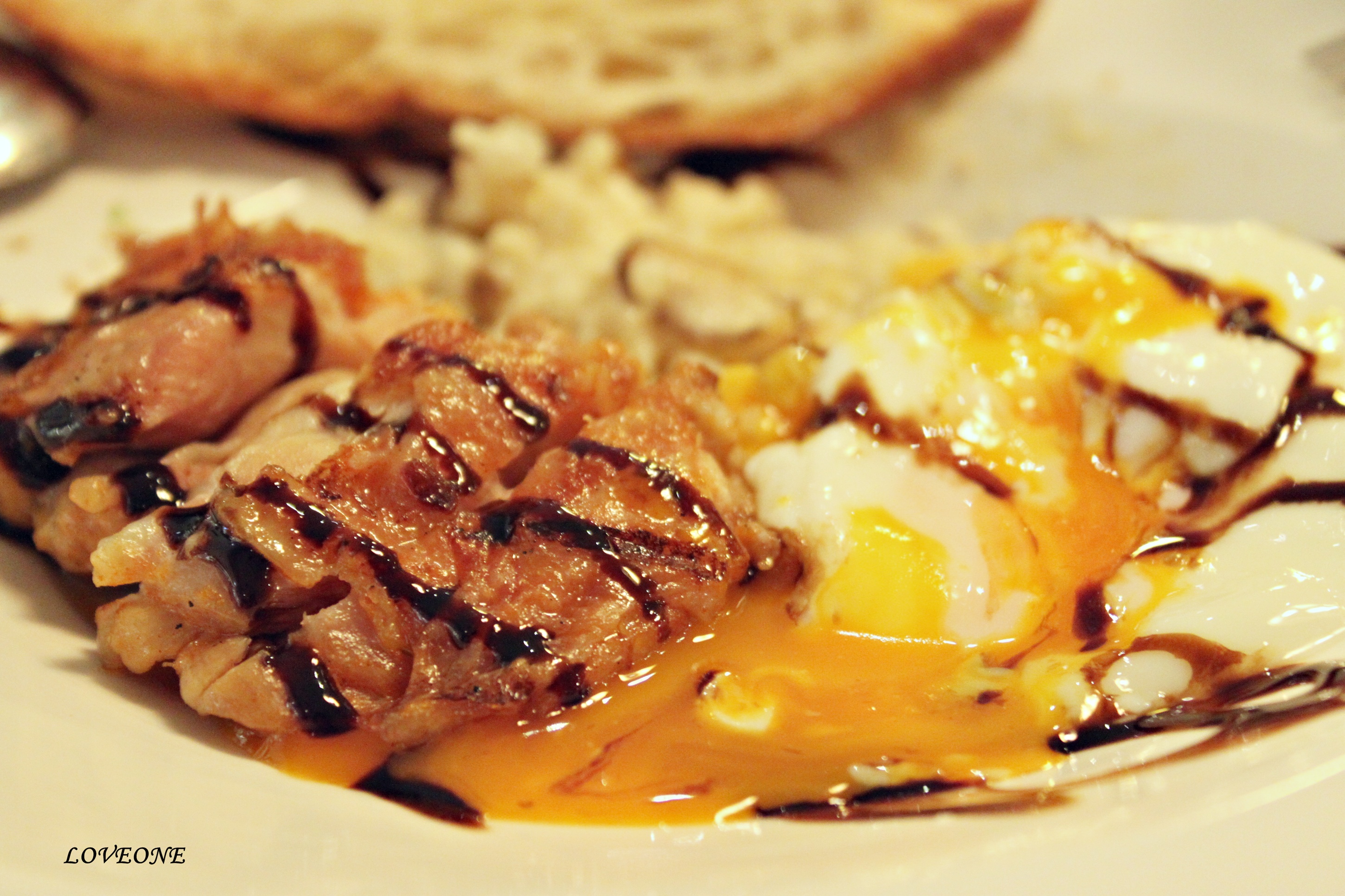 開始享用前請先戳破半熟蛋 讓金黃蛋液浸入燉飯裡 真是天堂好滋味 如果跟我一樣喜愛半熟蛋的人應該懂我的明白 烤雞肉多汁搭配起來完美