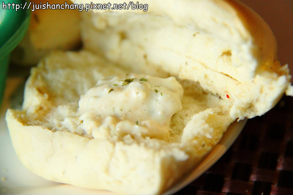 餐包:義式香料佛卡夏佐蒜味優格乳酪醬,乍看之下,這麵包是不是一點也不起眼啊……大錯特錯