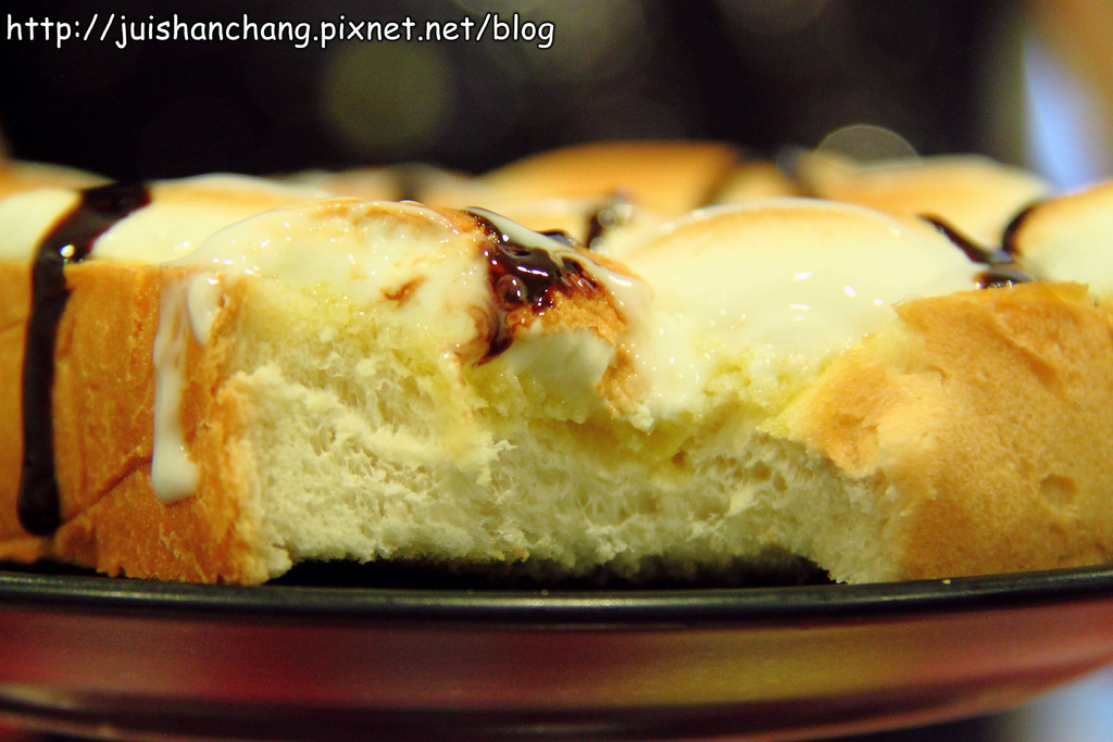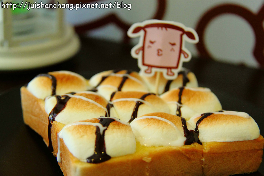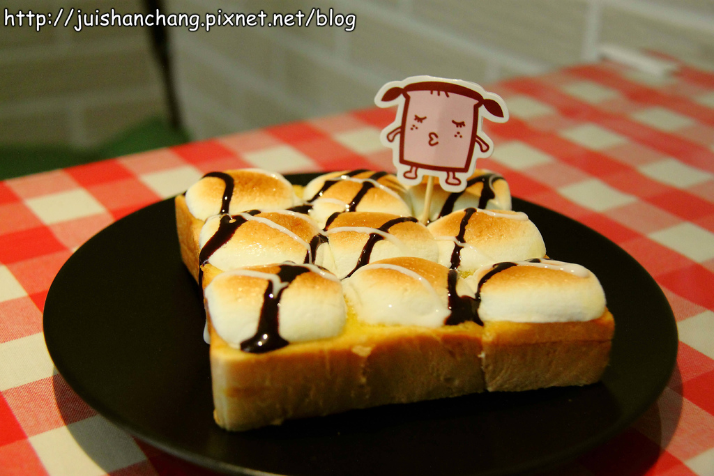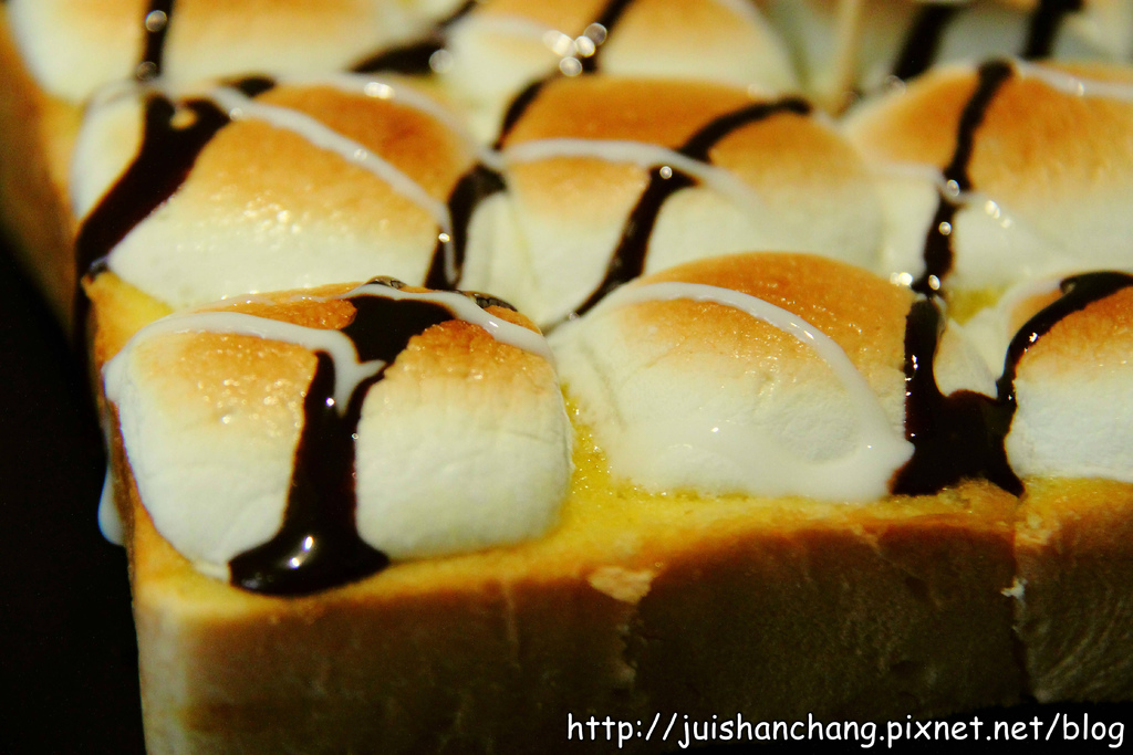這回點另一招牌:棉花糖厚片~吐司上有先塗上一層鹹奶油,擺上棉花糖之後再烤,烤好後淋上煉乳跟巧克力醬。
