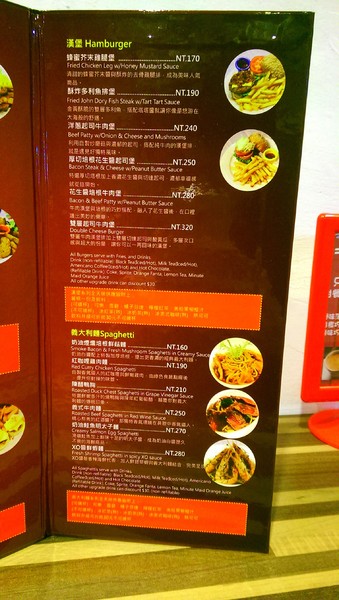主餐部分有:三明治、排餐、美式蛋捲、烘蛋、班尼迪克蛋、漢堡與義大利麵