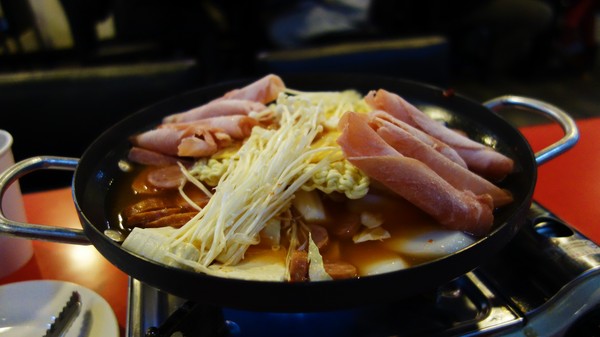 裡面有德式香腸、泡菜、洋蔥、焗豆、梅花肉片、起士片、拉麵、年糕。
