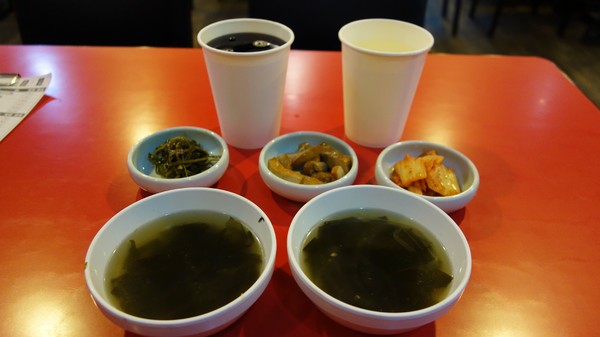 首先上桌的是兩杯飲料、小菜與海帶湯,