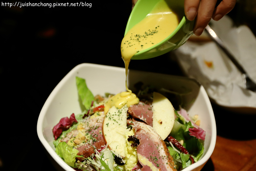 片薄的煙燻鴨胸佐上甜酸的蜂蜜芥末醬與新鮮的生菜一起入口,就像在嘴裡跳舞