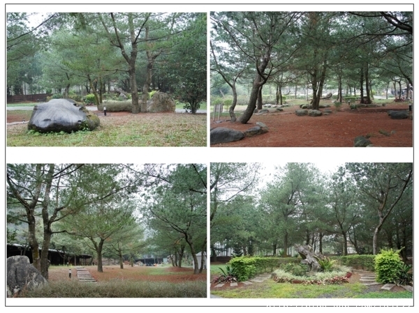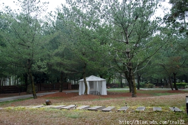趁雨勢稍緩,緩步在園區漫步,這裡的路面很平坦,對行動不便的老人家非常方便,走在抬頭不見頂的松園下,踏在鬆軟有彈性的松針上,耳中盡是各種不同的鳥鳴聲,好不熱鬧,當下好想拿手機把它錄下來當手機鈴聲,保證絕無僅有。林中有一頂白紗帳篷,原來,也有人和我一般無可救藥浪漫成癡,想坐在林中泡茶,又怕有從天上掉下來意外的禮物,所以,安了這白紗帳,太有趣了。