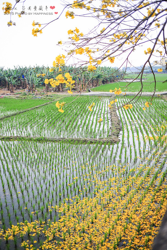 ▲▲▲掉落在水田裡的風鈴木花朵,將水田染成了一片黃金色的大地毯,交相輝映