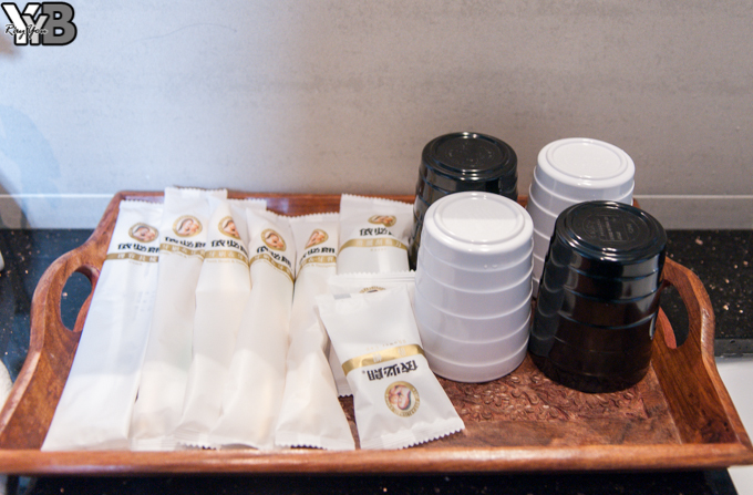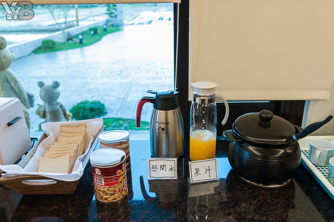 中間擺放了一個小茶几,上頭擺放了礦泉水、咖啡和茶包~