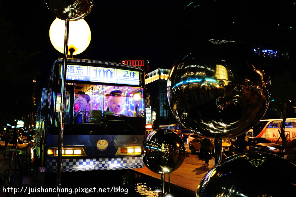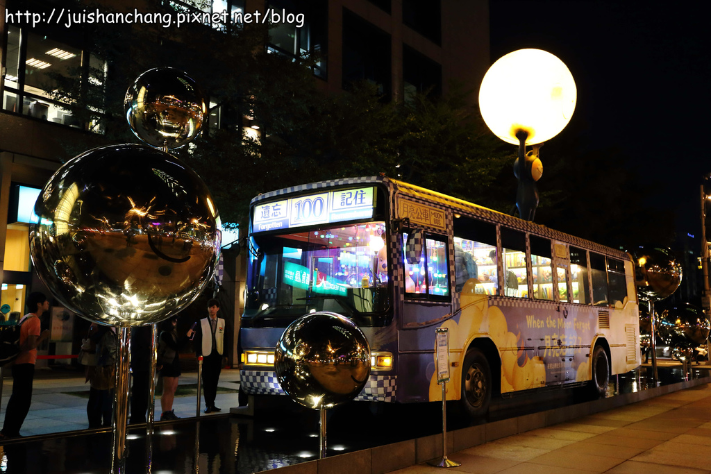 幾米月亮公車就位於101大樓斜對面的玉山銀行外,一整台大公車開上人行道,真的超搶眼哪~