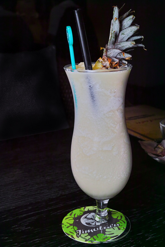 實際上 Pina Colada酒精度很低, 這天又請店家調更低點, 沒啥酒味, 香甜可口, 這裡的調法是比較溫和點, 椰奶的風味重些, 也有可能是用Malibu Rum之故