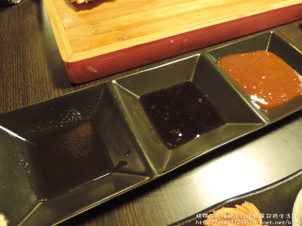從右邊橘紅色的開始分別是豬肉醬、牛肉醬、鹽巴加香油(還是麻油有點忘了)