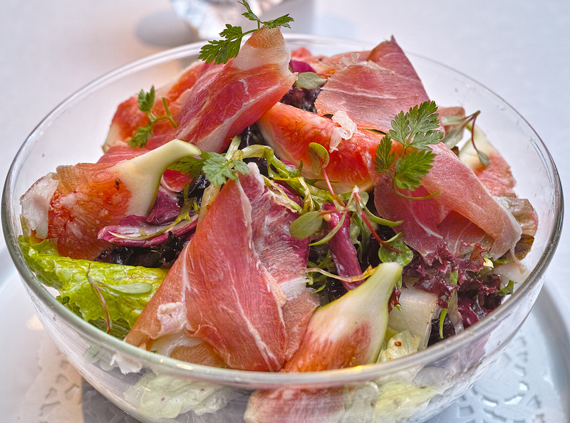 生菜大家都有, 只要新鮮就會好吃, 加無花果則較少見, 但吃起來蠻搭的, 最上面是很棒很棒的帕馬風乾火腿
