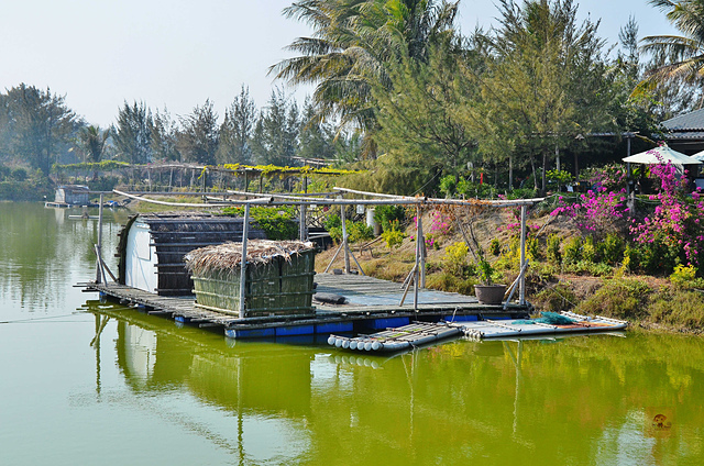 從 徒步區開始走個幾小步,漂亮的景色就在左手邊出現了,椰庭景觀餐廳是以環繞魚塭的方式去設計的,所以在園區內有大部份的面積都是魚塭,一片綠油油的池水還 讓人有種在草地上的錯覺。照片正中間的是以前的魚塭工作室,讓魚民可以在魚塭過夜和照顧魚池的用途,現在也非常少見了,算是還蠻有歷史意義的,聽說之後有 打算開放成民宿,讓大家睡在水面上,感覺就還蠻酷的。