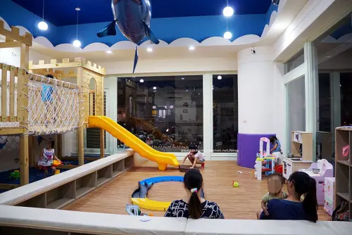 一二樓的空間.一樓是用餐區.二樓有遊戲室.童書區以及戶外的沙坑區