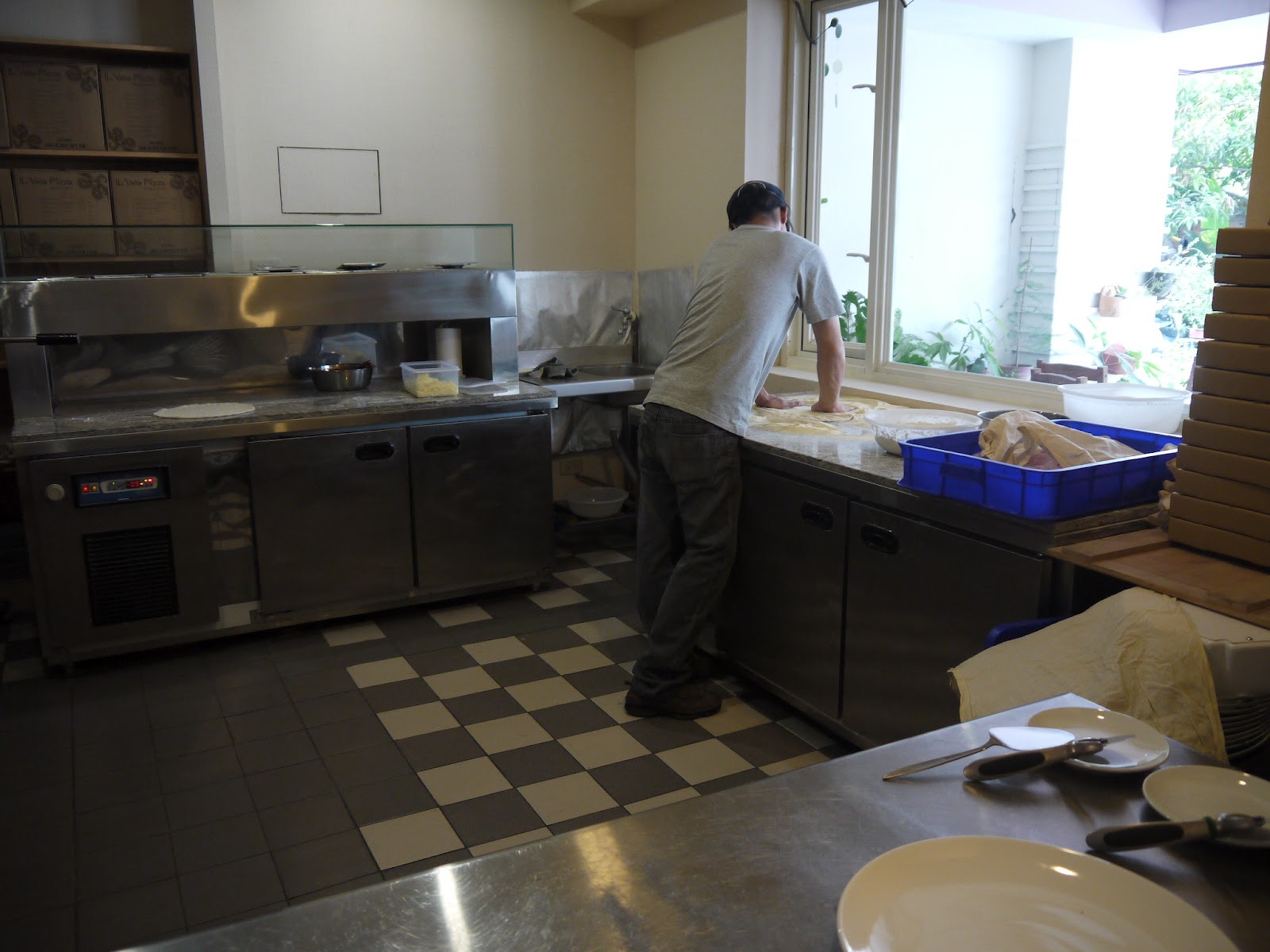 在等待的時間裡,因為對一直默默做披薩的老闆感到非常好奇,所以就來拍拍他~顆顆