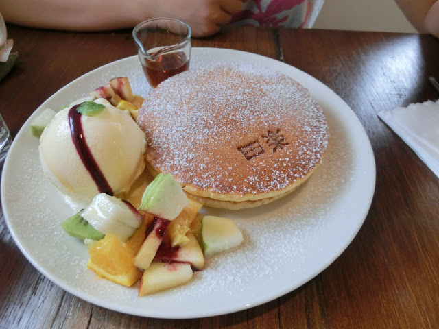 香港友人點的甜鬆餅,雖然是四季水果 但是水果份量有點少 可能盤子也裝不下了吧!但是搭配香草冰淇淋 是她喜歡的那種有奶粉味道的冰淇淋她很喜歡喔!