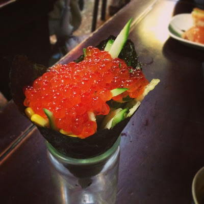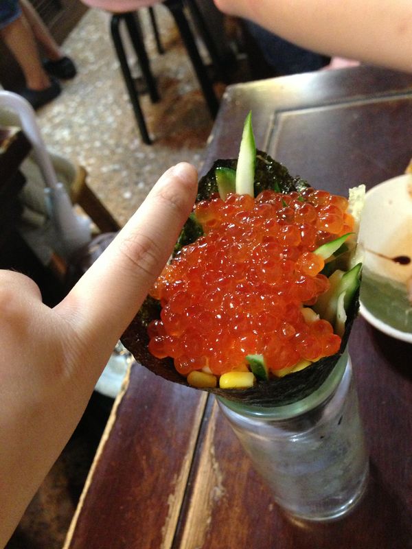 | 鮭魚卵手捲140 NTD 其實我們很猶豫到底還要不要再點 因為我們只有兩個人 我覺得我們再吃下去就會爆掉 但是 為了要寫食記 好像應該來介紹一下他們的手捲 所以最後還是點了 手卷來的時候 Hee小姐我的下巴又要掉下來了 為什麼呢? |