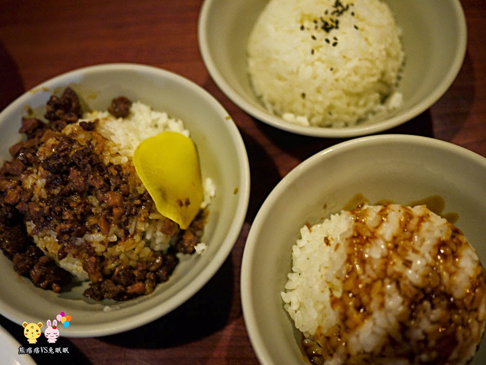 白飯、肉燥飯與豬油拌飯,肉醬淋的超多,個人覺得太油膩了,又剛好我們點的菜單片重鹹,所以到後面覺得,其實點白飯就夠了。