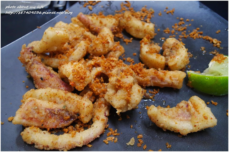 外層粒粒酥脆的炸衣還多了點帶著蒜香(?)的甜味 透抽又Q又甜 適時擠點檸檬的酸味 好吃!