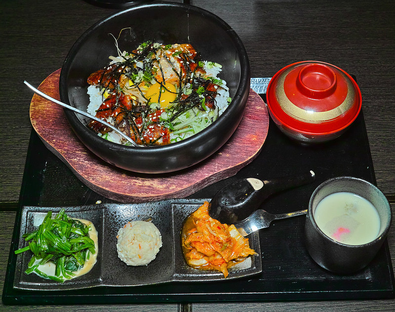 定食的內容有鰻魚石鍋拌飯, 味增湯, 茶碗蒸, 以及小菜