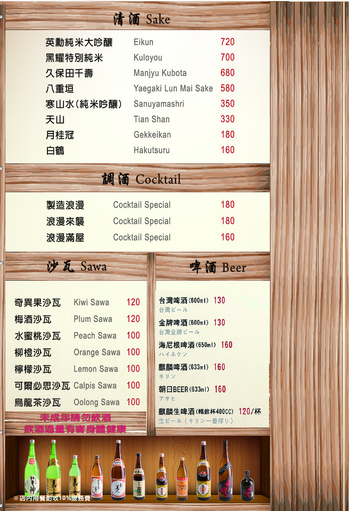 酒類的話各式日本酒自然是有的, 以清酒為主, 此外調酒或沙瓦也都一應俱全