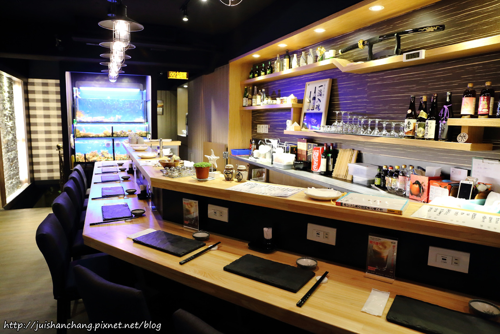 餐廳內部裝潢採用日式空間氛圍,日式吧檯的用餐區