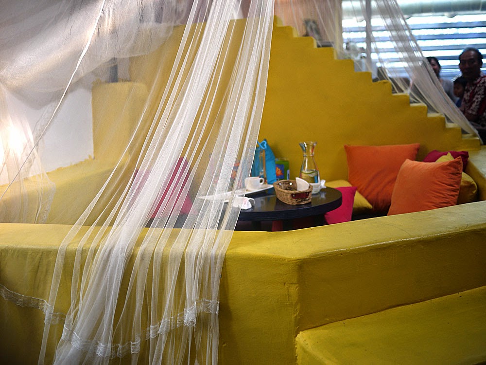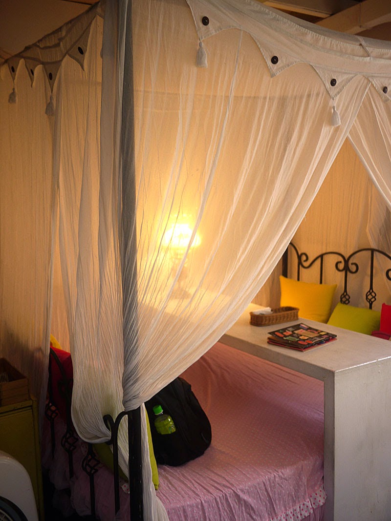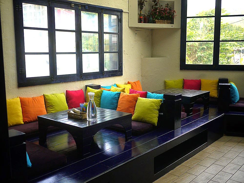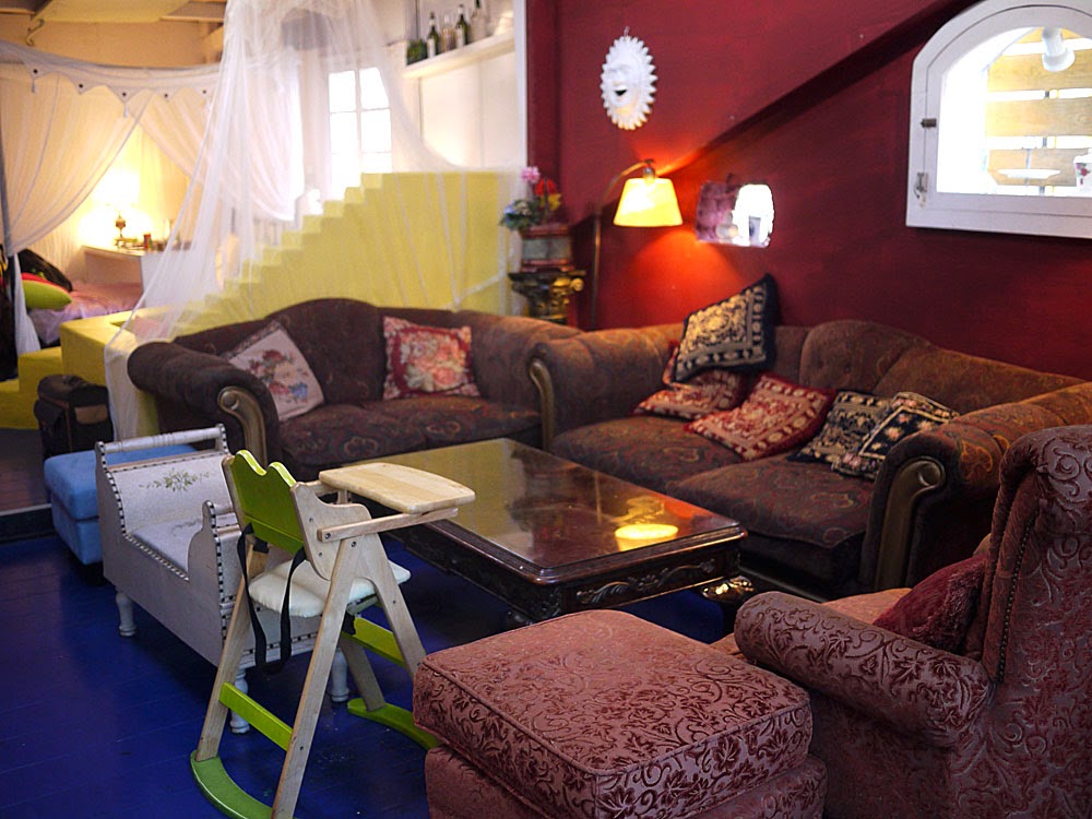 垂吊的白色布簾,將一區一區的座位區分開來,五顏六色的抱枕增加了不少色彩,適合多人聚會的地方,大人應該需要盤腿坐吧。