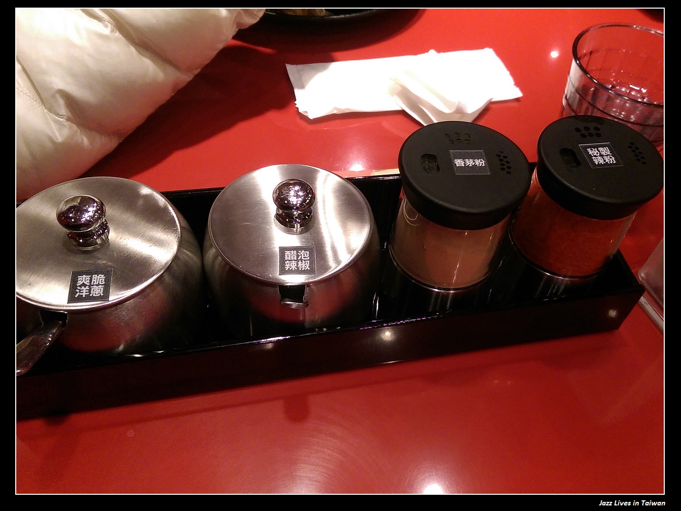 調味料有四種, 爽脆洋蔥, 醋泡辣椒, 香茅粉, 秘製辣粉,