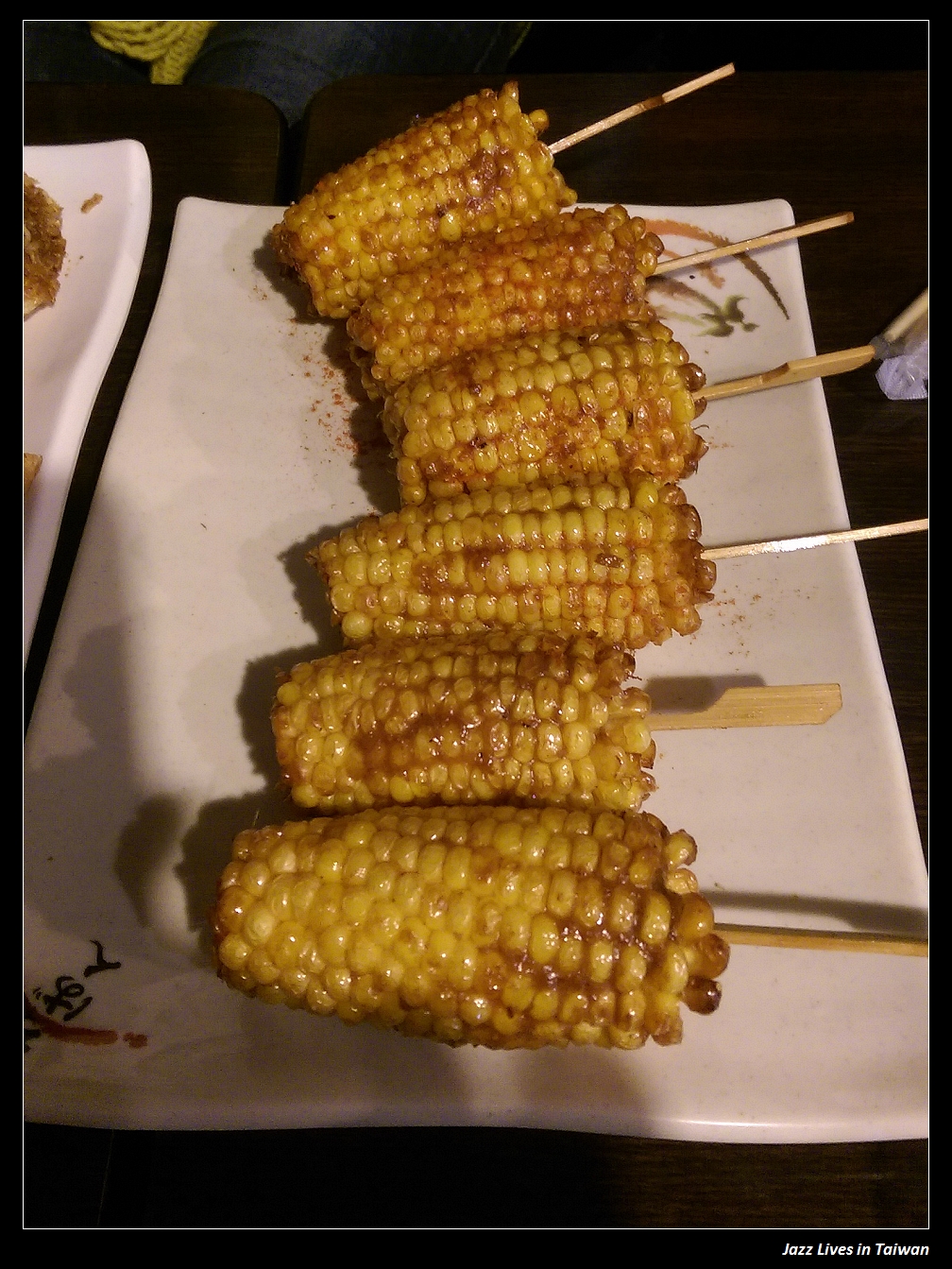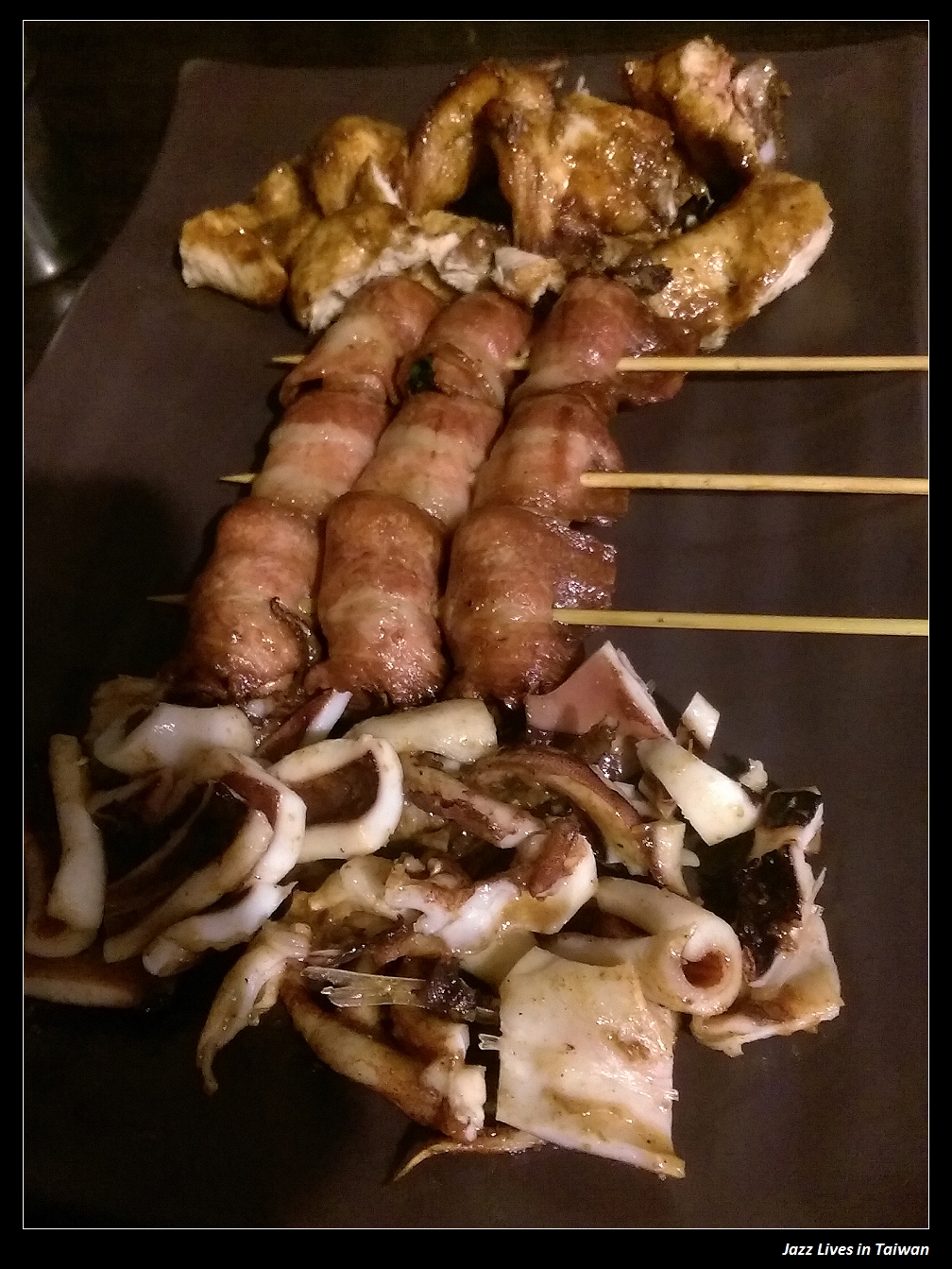 烤肉串, 青椒, 四季豆, 培根捲, 烤肉串灑上孜然粉是最近這十幾年來的流行, 培根捲裡面捲著杏鮑菇, 很有創意, 不過口感只能說還OK啦!
