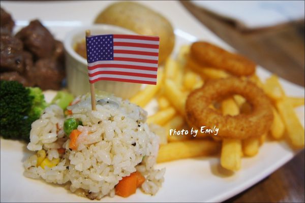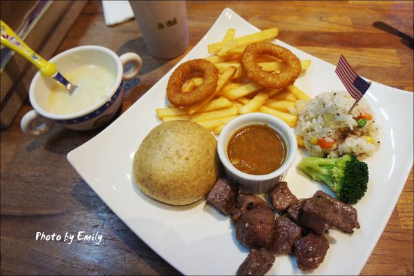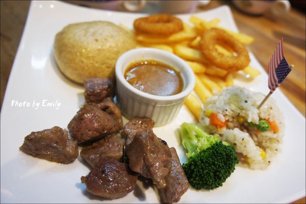 沙朗方塊牛排,搭配餐包、蔬菜飯、薯條、洋蔥圈,擺盤非常精緻豐富