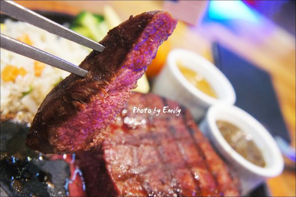 當一刀切下,甜美肉汁頃刻汨汨流出,鐵板煎烤後的美味,讓牛排呈現微焦樣貌