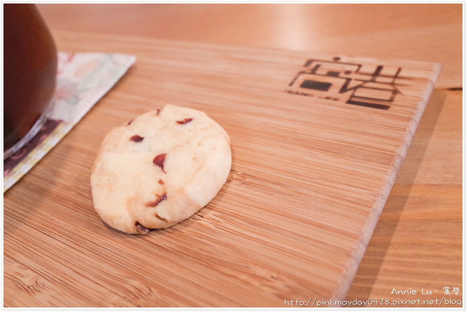 透明罐子附有手把,旁邊附了片手工餅乾,是蔓越莓口味的