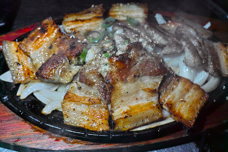雖說是鐵板, 但底下墊了很厚的洋蔥, 所以不至於因為聊天就都焦掉了