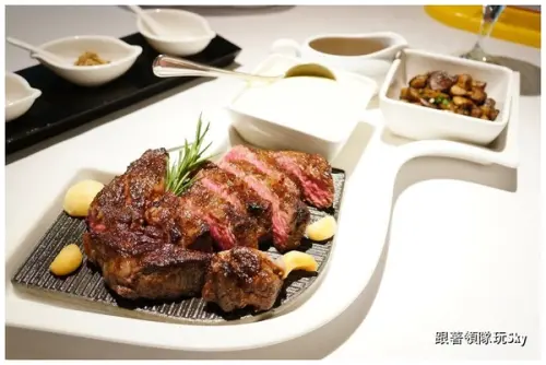 美國濕式熟成45天極黑神戶肋眼牛排(2人份) 16盎司 NT6700 元 整個牛排餐以波浪S磁盤裝著,牛排底下有具保溫功能的鐵盤,同時服務生也會送上熱熱的大盤子讓客人方便食用牛排,牛排也都為我們切好,放在盤中只要再對切一兩次就可以入口。