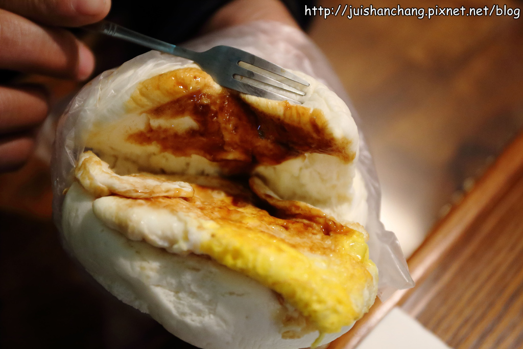 他們家的蛋餅,與西式蛋餅不同,是用麵糊煎成,比較有嚼勁,搭配醬油膏與老闆特製醬汁