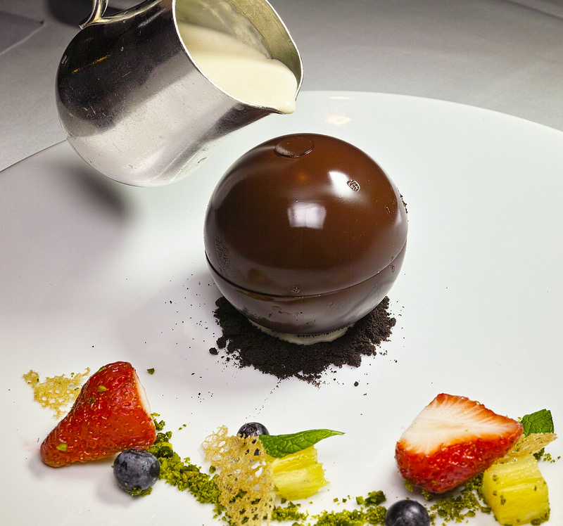 等等,侍者把牛奶澆下去了.....這這這, 是要在巧克力上加點牛奶裝飾?