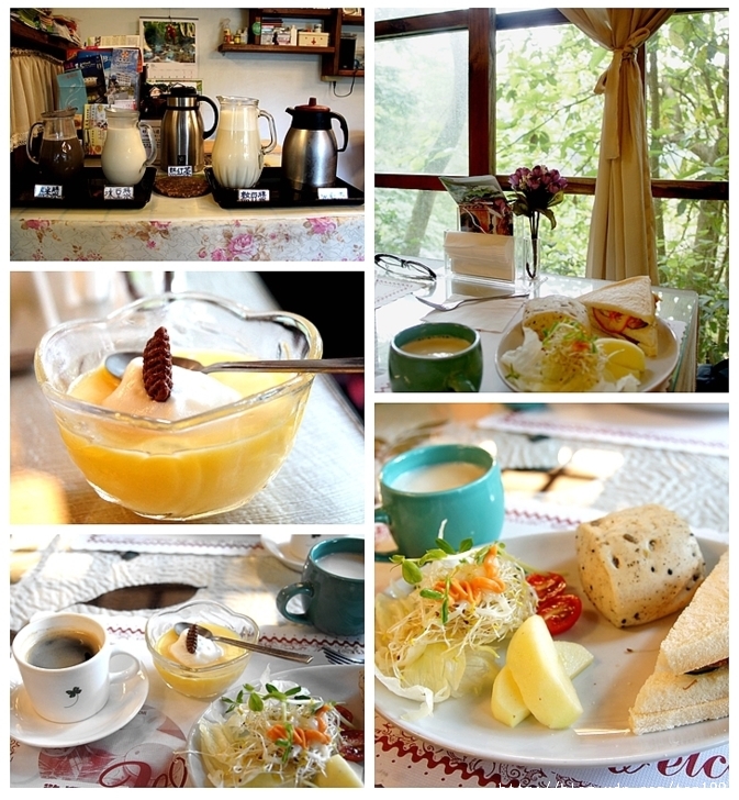 這一夜,沒有開冷氣,一覺睡到不知今夕何夕,待睜開眼竟然已近八點,距民宿提供早餐時間8:00~9:00不遠,匆匆漱洗趕到餐廳,眼前四壼現打米漿、豆漿誘人食慾,透明玻璃窗將樹影投入室內,映在桌几上,一片醒目的綠意,讓人頓時神清氣爽,手工的雜糧饅頭、蒸布丁、生菜水果沙拉、三明治,五形一次到位,養生的概念十足。