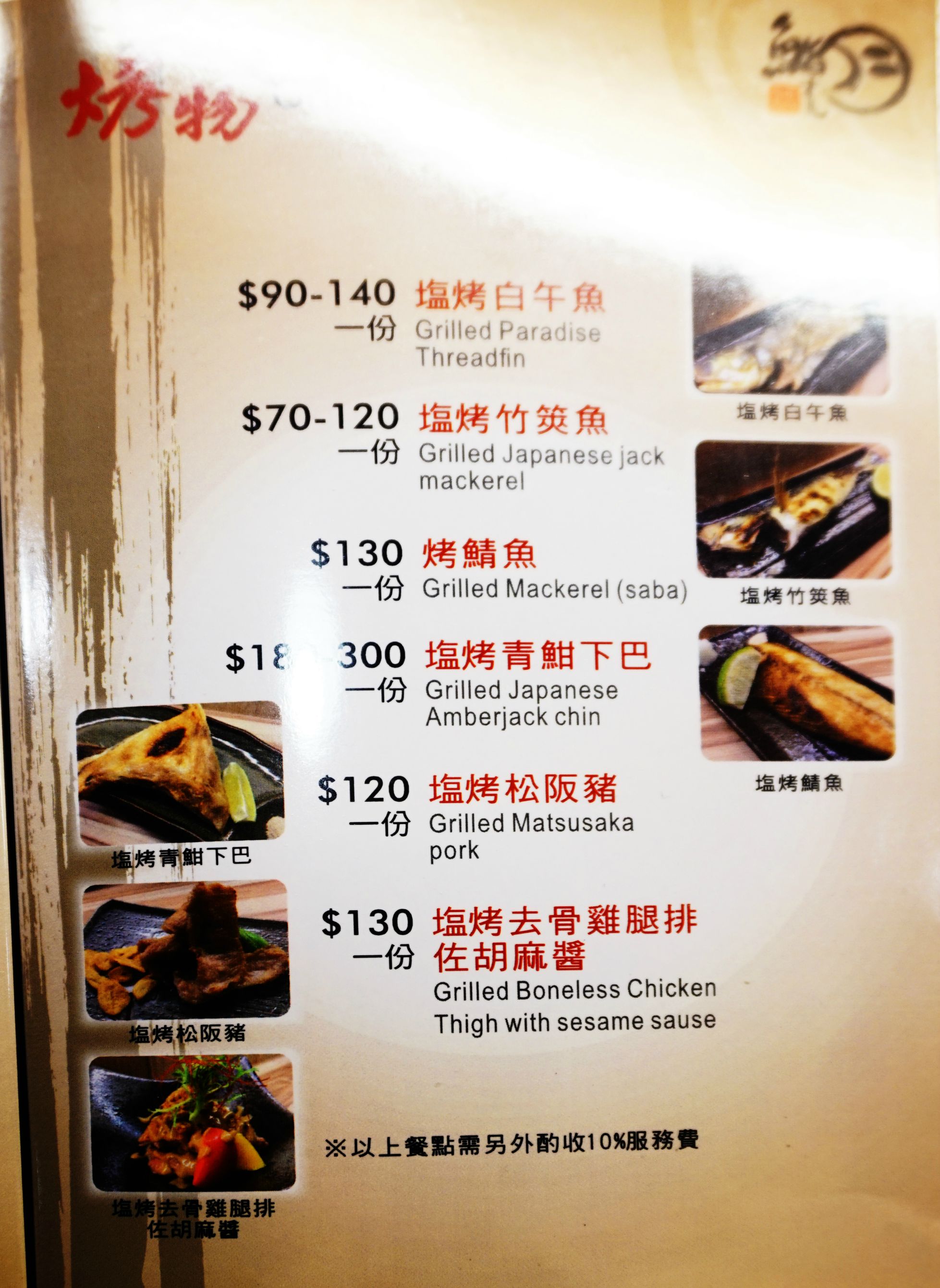 | 烤物 | 鹽烤白午魚 | 任選1 | |