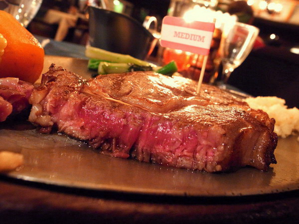 先用牛排刀劃下一小塊肉淺嚐與咀嚼一番,廚師經驗功力夠五分熟拿捏得宜,
