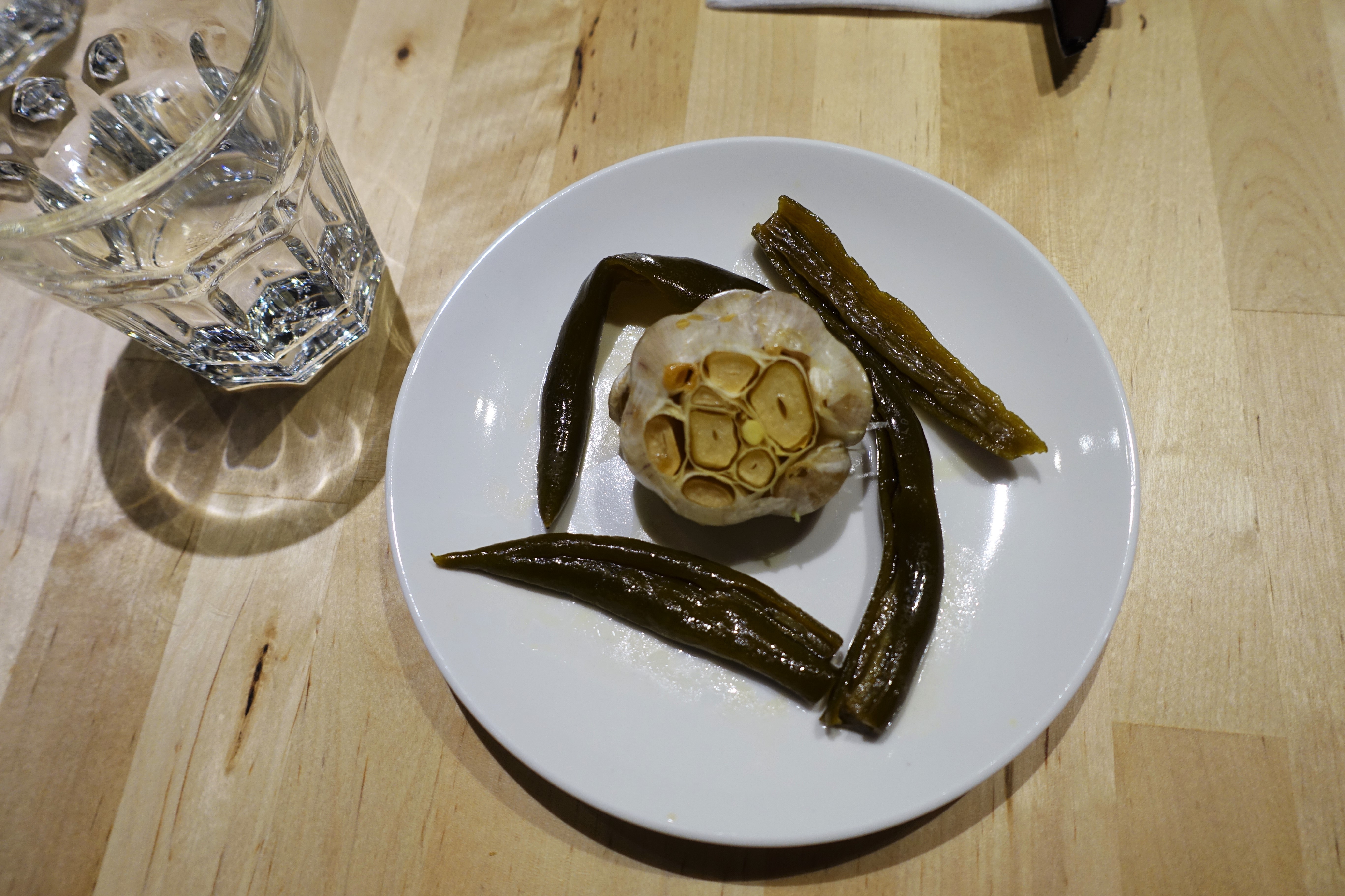 另外排餐還有附配料:蒜頭與剝皮辣椒,朋友A非常推薦肋眼跟剝皮辣椒一起吃,